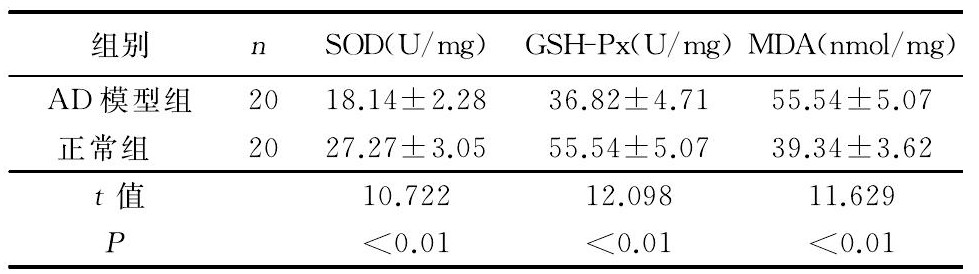 與正常組對應(yīng)的3個指標比較, AD模型組SOD、GSH-Px活性明顯降低, 而MDA含量明顯升高。詳見表1。