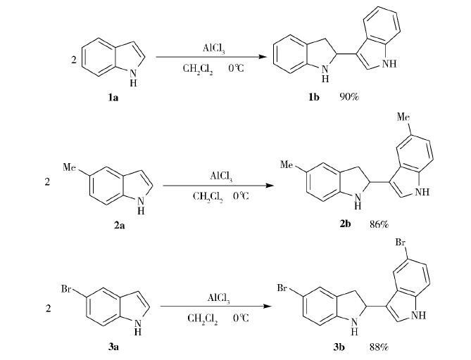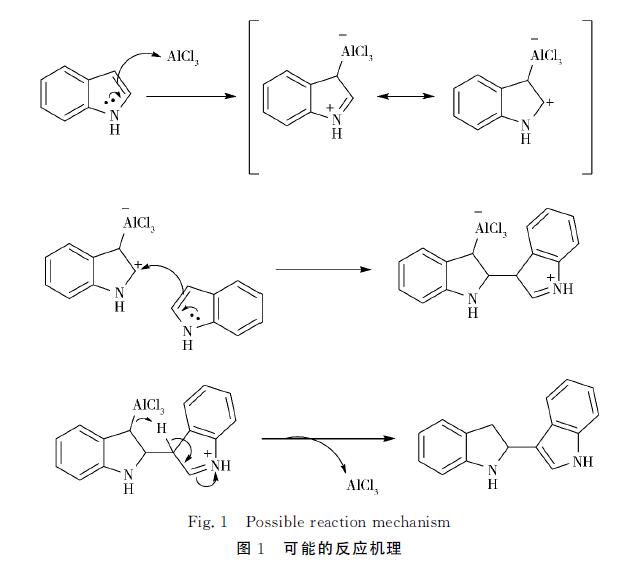 2.2 反應(yīng)機理討論 筆者結(jié)合相關(guān)文獻及實驗結(jié)果,提出了可能的反應(yīng)機理:首先三氯化鋁活化吲哚的C-3位,生成亞胺 離子中間體,使吲哚的C-2位顯正電性;接下來另一分子吲哚C-3位的碳原子進攻這個正電中心[17], 實現(xiàn)偶聯(lián);偶聯(lián)中間體發(fā)生質(zhì)子轉(zhuǎn)移[并失去三氯化鋁形成最終產(chǎn)物,離去的三氯化鋁繼續(xù)催化反應(yīng) (圖1)。